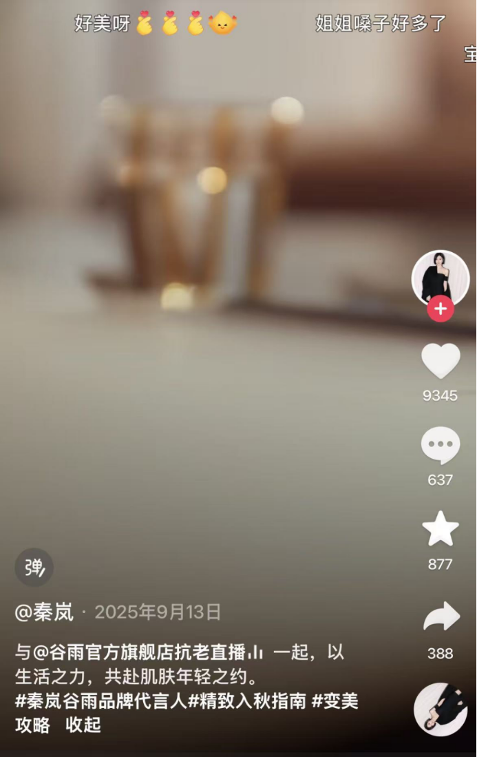 2025年9月13日,秦岚在抖音发布谷雨宣传视频,@谷雨官方旗舰店抗老直播,文案写道:与谷雨官方旗舰店抗老直播一起,以生活之力,共赴肌肤年轻之约。