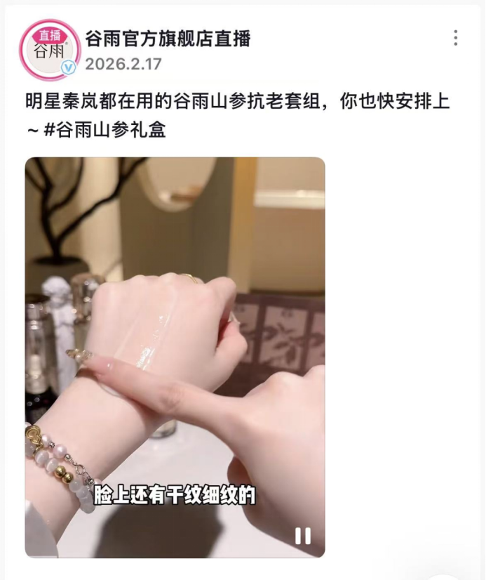 2026年2月17日,谷雨再度发布宣传视频,直接喊话:明星秦岚都在用的谷雨山参抗老套组,你也快安排上。