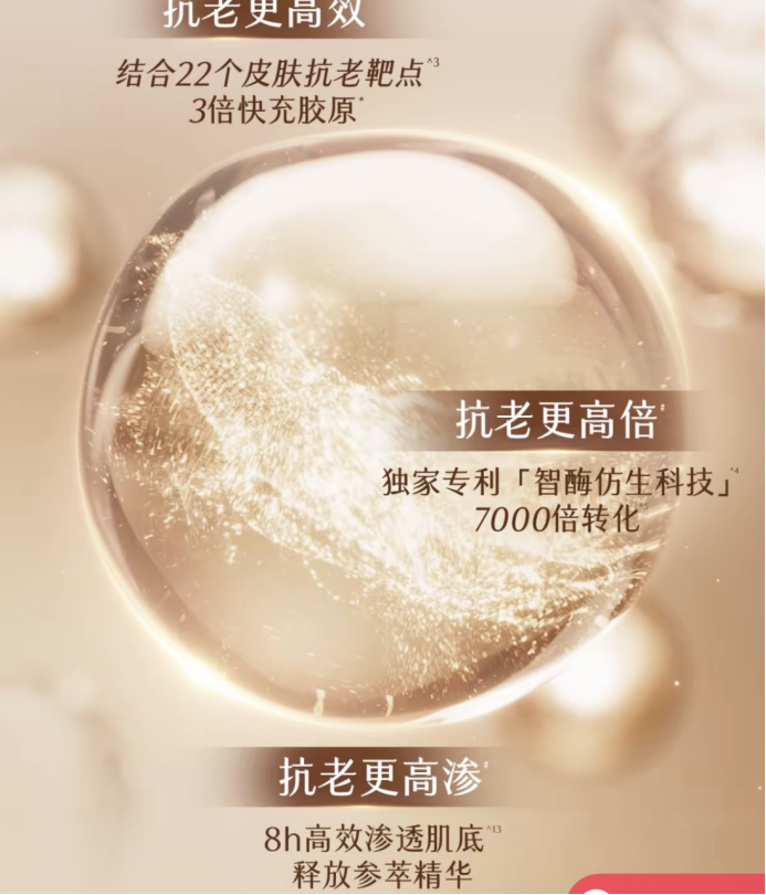 “结合22个皮肤抗老靶点,3倍快胶原,抗老更高效;独家专利智酶放生科技7000倍转化,抗老更高倍;8h高效渗透肌底,释放参萃精华。”