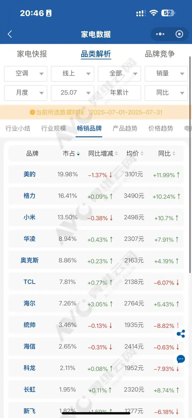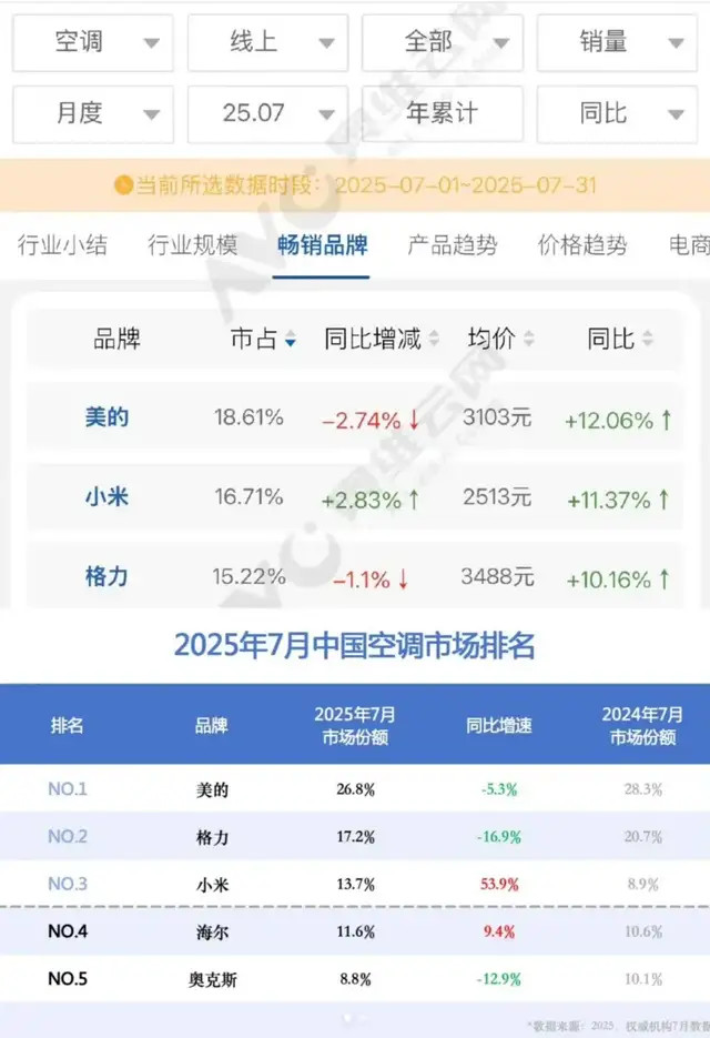 事实上,在传统意义上的空调市场,真正的第一另有其人。查阅奥维云网数据一目了然:2025年7月份线上空调市场份额第一名为美的(19.98%)、第二名为格力(16.41%),第三名为小米(13.50%)。