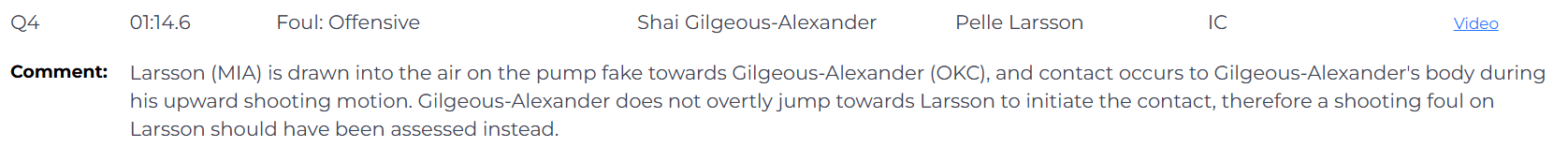 虎扑01月19日讯 拉尔松(迈阿密热火队)在面对亚历山大(俄克拉荷马城雷霆队)的假动作时被晃到空中,而在亚历山大向上投篮的过程中,两人发生了身体接触。亚历山大并没有明显地朝着拉尔森跳过去主动制造接触,因此,本该吹罚拉尔松的投篮犯规。