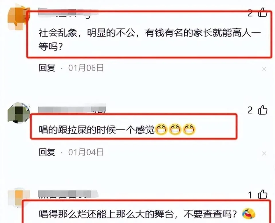 跑调、节奏混乱,再加上现场屏幕歌词不同步、音响效果拉胯,有观众当场高喊退票,吐槽“花钱不是来看一家三口唱K”。