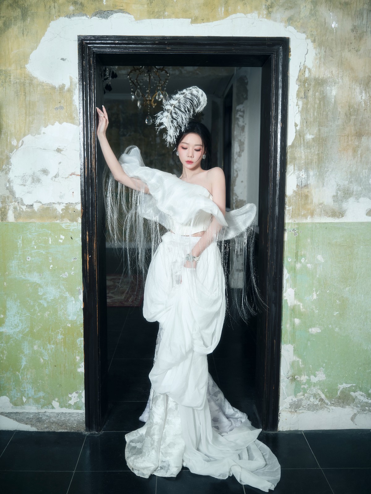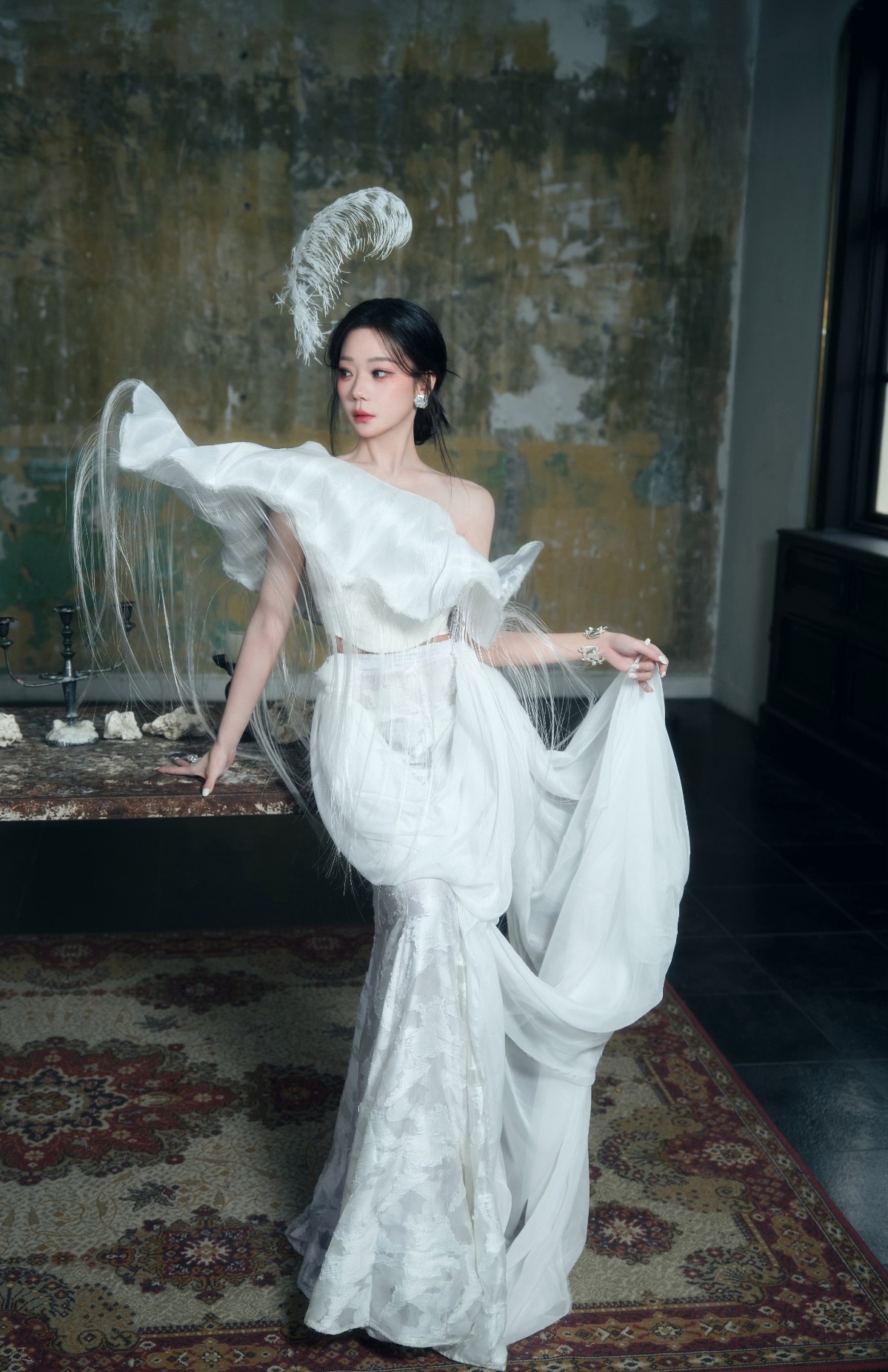 她的造型堪称视觉魔术:一边是雕塑感十足的斜肩廓形,用层叠白纱堆出建筑般的立体感;另一边,银白丝线从衣摆垂落,像风轻轻吹过时间的缝隙,给厚重添了点会呼吸的轻盈。最绝的是头顶那支巨型白色鸵鸟毛——不是装饰,是宣言!它嚣张地戳破了“精致必须小巧”的刻板印象,在复古背景里炸出一朵超现实的花。