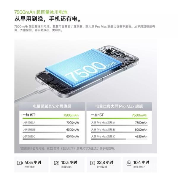 续航是一加15T最亮眼的标签。通过器件小型化与精密堆叠工艺,它在6.32英寸机身内塞入了7500mAh冰川电池,相比上代容量提升20%,重量仅增加9g(194g)。配合100W有线闪充与50W无线闪充,50分钟即可完全充满,还支持全局旁路供电,边充边玩不发热。