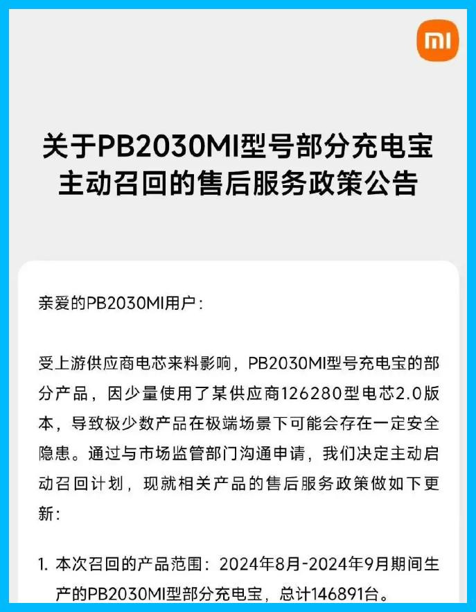 8月29日,小米宣布召回14万7千台自带线充电宝20000 33W(型号:PB2030MI),原因是“部分电芯原材料来料原因,极少数产品在使用过程中可能会出现过热现象,在极端场景下存在燃烧风险”。