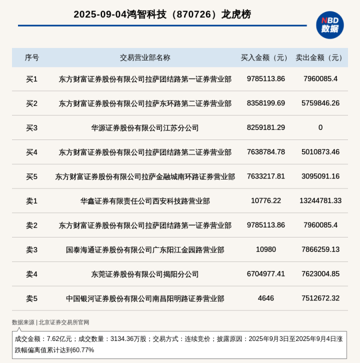 每经讯,2025年9月4日长沙炒股配资公司,北交所上市公司鸿智科技(870726,收盘价:28.37元)登上龙虎榜,交易方式是连续竞价,披露原因是2025年9月3日至2025年9月4日涨跌幅偏离值累计达到60.77%,成交数量3134.36万股,成交金额7.62亿元。买一席位为东方财富证券股份有限公司拉萨团结路第一证券营业部,买入978.51万元;卖一席位为华鑫证券有限责任公司西安科技路营业部,卖出1324.48万元。