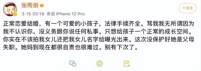 直到事情瞒不住了,才发文承认已婚,却连吴倩的名字都没提,只称她为“孩子她妈”,也正是因为这件事,张雨剑被贴上了“渣男”标签,口碑一落千丈。