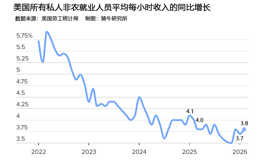 美国劳工统计局的数据显示,2026年2月美国平均小时工资环比增长0.4%,同比增长3.8%,均高出预期0.1个百分点。