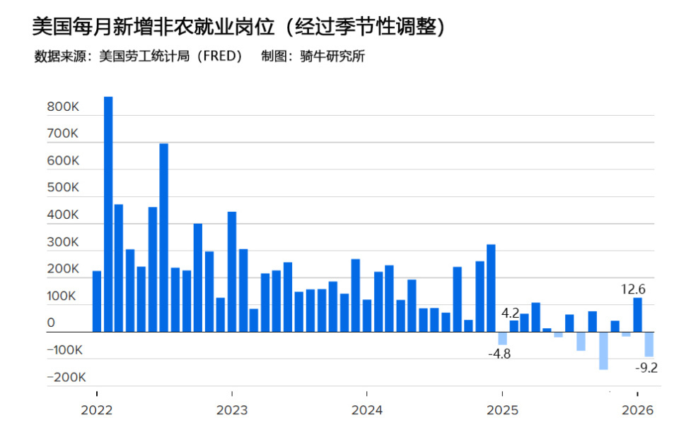 3月6日(周五),美国劳工统计局发布非农就业报告称,受严冬天气和一家主要医疗服务机构刚好在调查周罢工的影响,2026年2月美国非农就业数据意外减少了9.2万人。