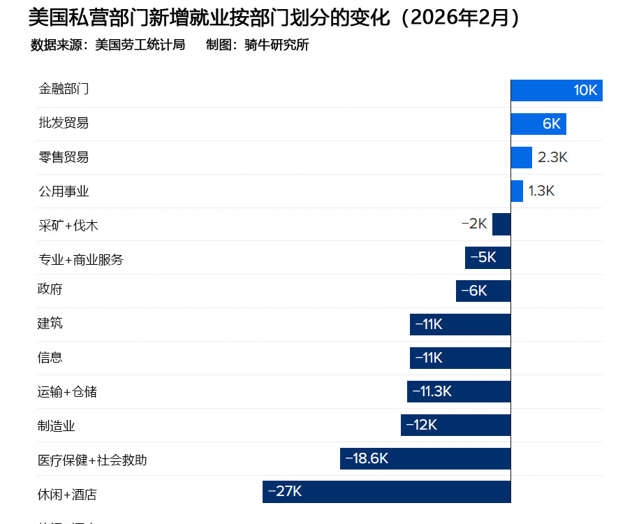 信息服务行业,这一受人工智能相关削减冲击的行业,2月减少了1.1万个岗位,形成了12个月平均每月流失5,000个岗位的趋势。尽管关税旨在将海外岗位回流,2月制造业仍损失了1.2万个岗位。