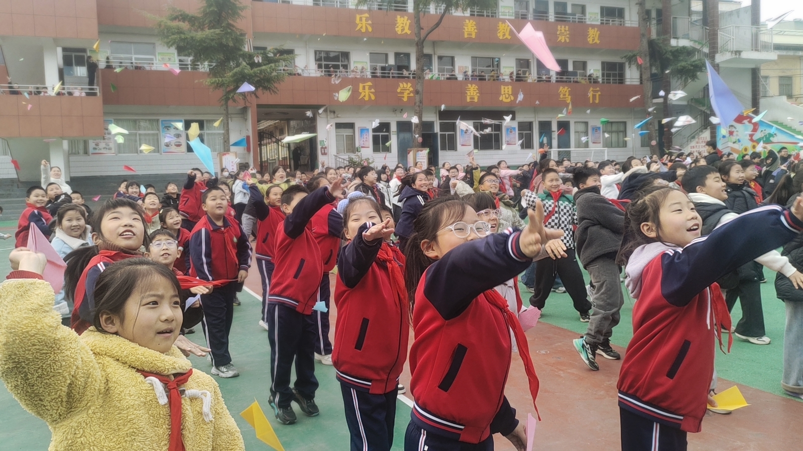 最激动人心的时刻,是一场关于梦想的“起飞”。全体学生手持亲手折叠的纸飞机,高举过头顶。在“3、2、1,放飞!”的齐声倒数中,五彩斑斓的纸飞机如春花般绽放,飞向蓝天。这一刻,不仅是对新学期的美好期许,更是一次温暖的约定——把眼睛从屏幕移向远方,和小伙伴们一起在阳光下奔跑,让梦想在脚下的土地上生根开花!